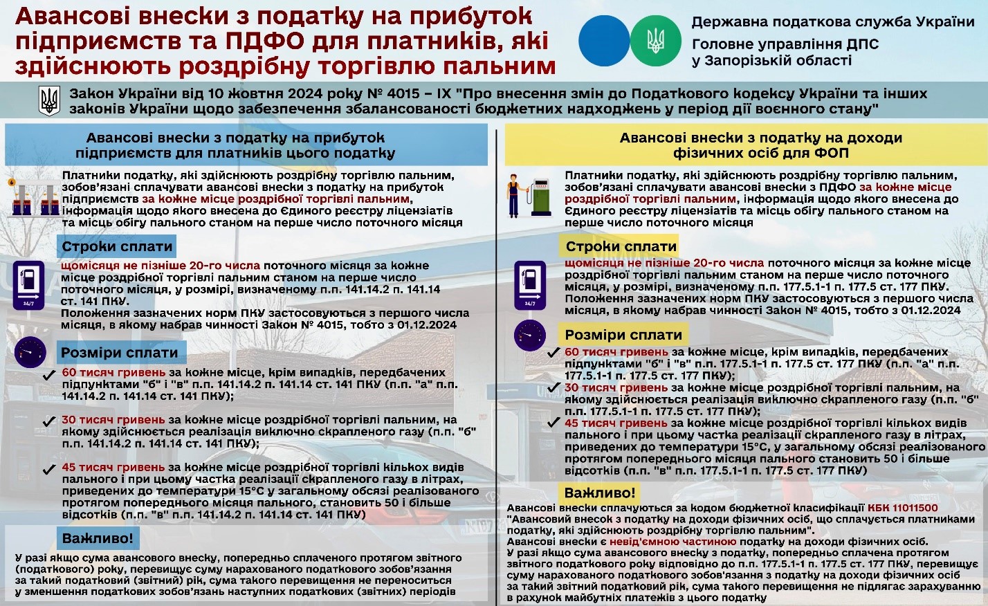 Нагадуємо, що 01.12.2024 набрав чинності Закон України від 10.10.2024 № 4015-IX (далі — Закон № 4015), яким запровадили сплату авансових внесків з податку на прибуток підприємств та податку на доходи фізичних осіб платниками, які здійснюють роздрібну торгівлю пальним.