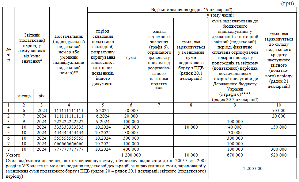 • щодо рядка 6 таблиці 1 додатка 2 до декларації (постачальник з індивідуальним податковим номером 555555555555) — зменшення суми від’ємного значення у розмірі 100 000 гривень;