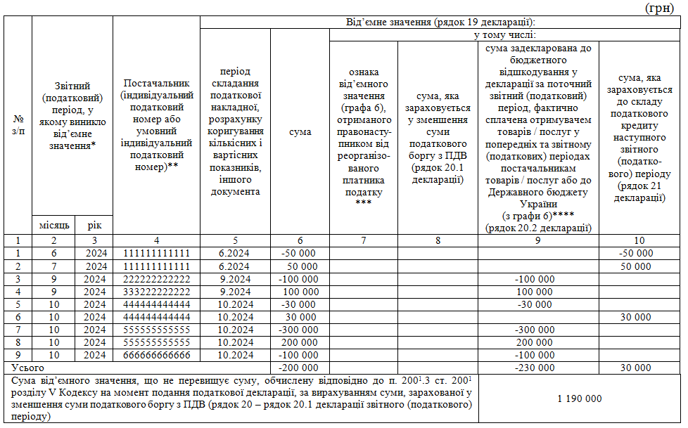 • щодо рядка 5 таблиці 1 додатка 2 до декларації (постачальник з індивідуальним податковим номером 444444444444) — суму від’ємного значення у розмірі 30 000 грн в повному обсязі зараховуйте до складу податкового кредиту наступного звітного (податкового) періоду (рядок 21 декларації);