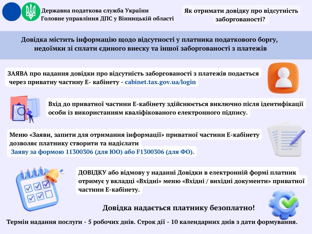 Довідка формується за відсутності у платника за даними інформаційно-телекомунікаційних систем контролюючих органів податкового боргу, та/або недоїмки зі сплати єдиного внеску, та/або іншої заборгованості з платежів (у тому числі розстрочених, відстрочених, реструктуризованих), контроль за справлянням яких покладений на контролюючі органи.