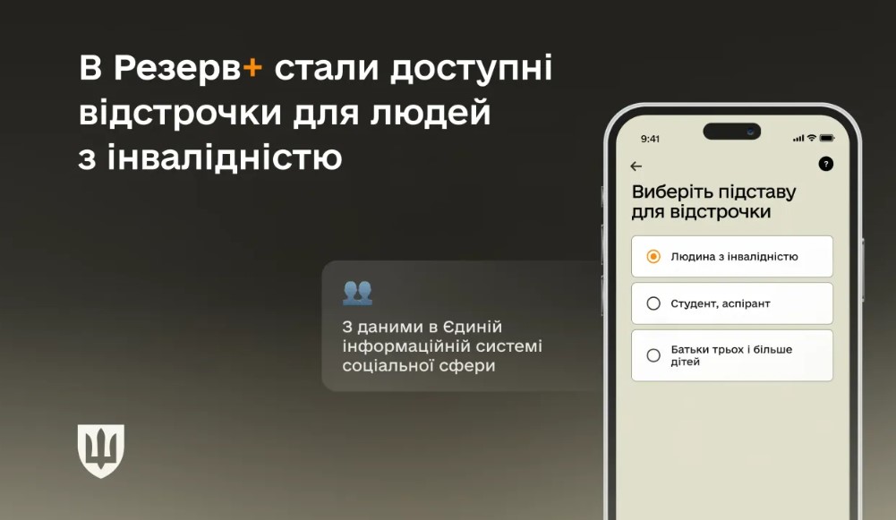 У застосунку Резерв+ стали доступні відстрочки для людей з інвалідністю, дані про яких є в Єдиній інформаційній системі соціальної сфери (ЄІССС). Раніше відстрочку онлайн могли оформити лише люди з інвалідністю, дані яких знаходились в реєстрі Пенсійного фонду України, та мали відповідне пенсійне посвідчення.